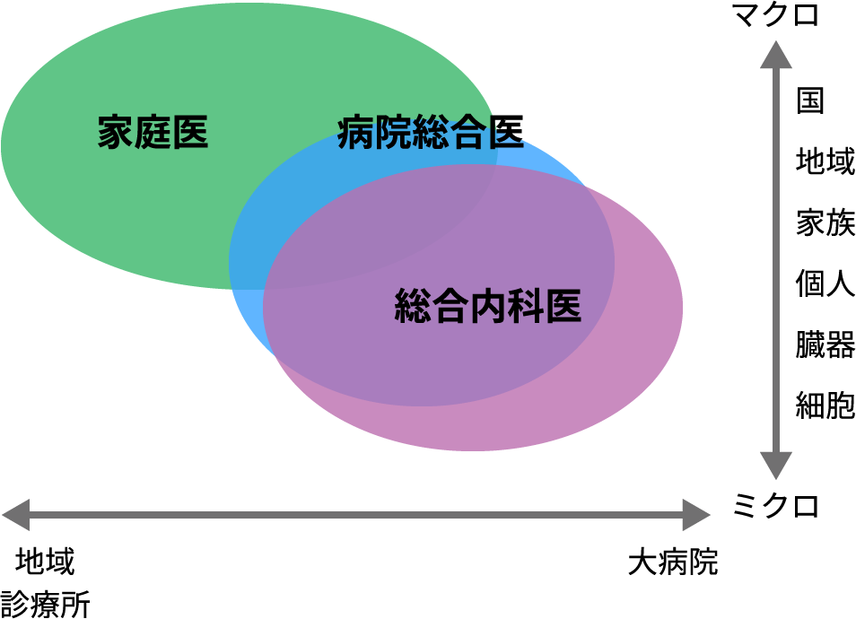 総合内科は、病院総合とかなり重なりますが、病院総合医よりさらにミクロよりの視点を持っていると示しています。